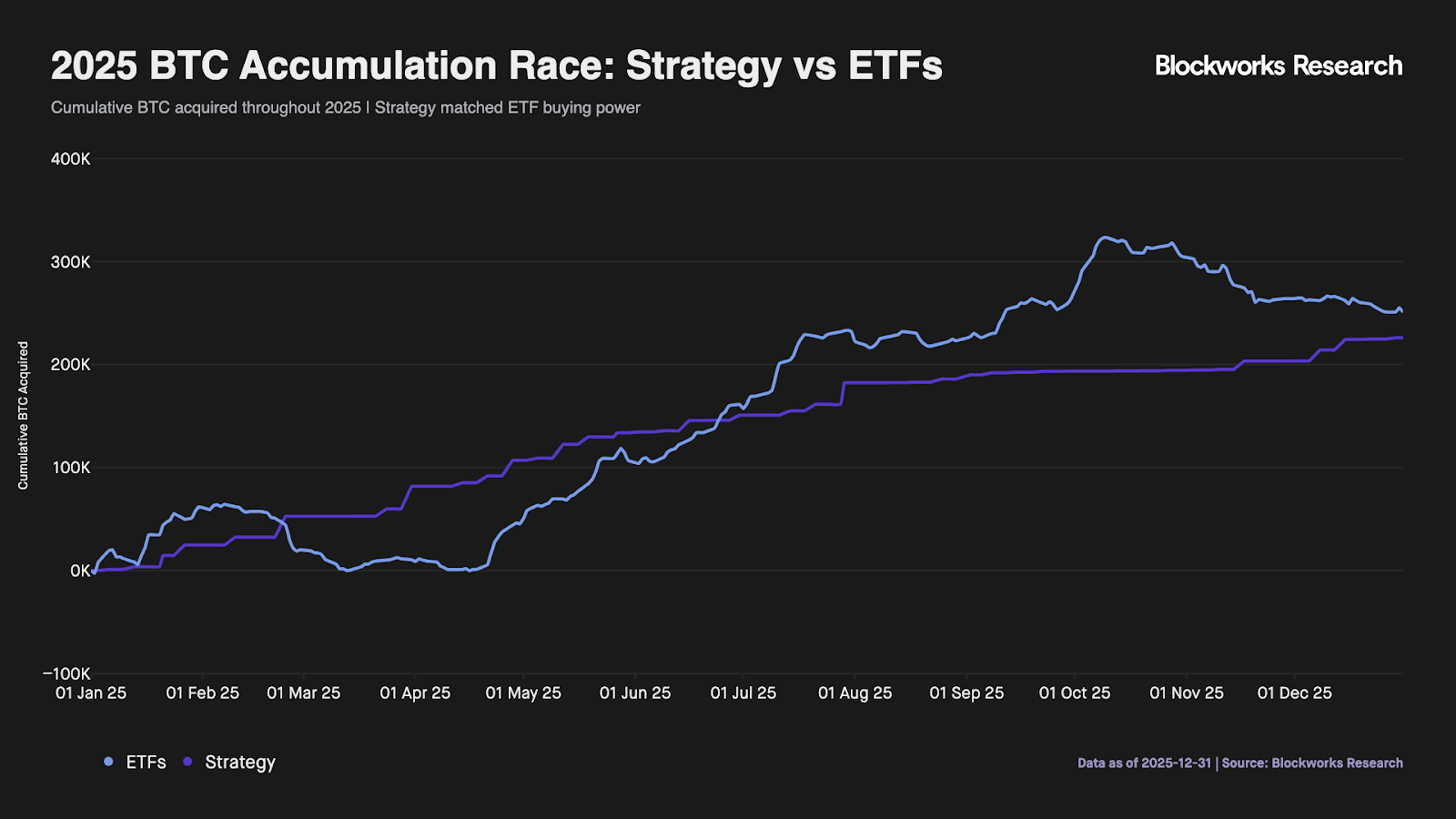 Zooming out, 2025's marginal bid was essentially a two-horse race: spot ETFs and Strategy. On the accumulation chart, Strategy's cumulative purchases tracked in the same range as ETFs for much of the year, meaning Strategy was comparable in flow impact to the ETF complex at points.