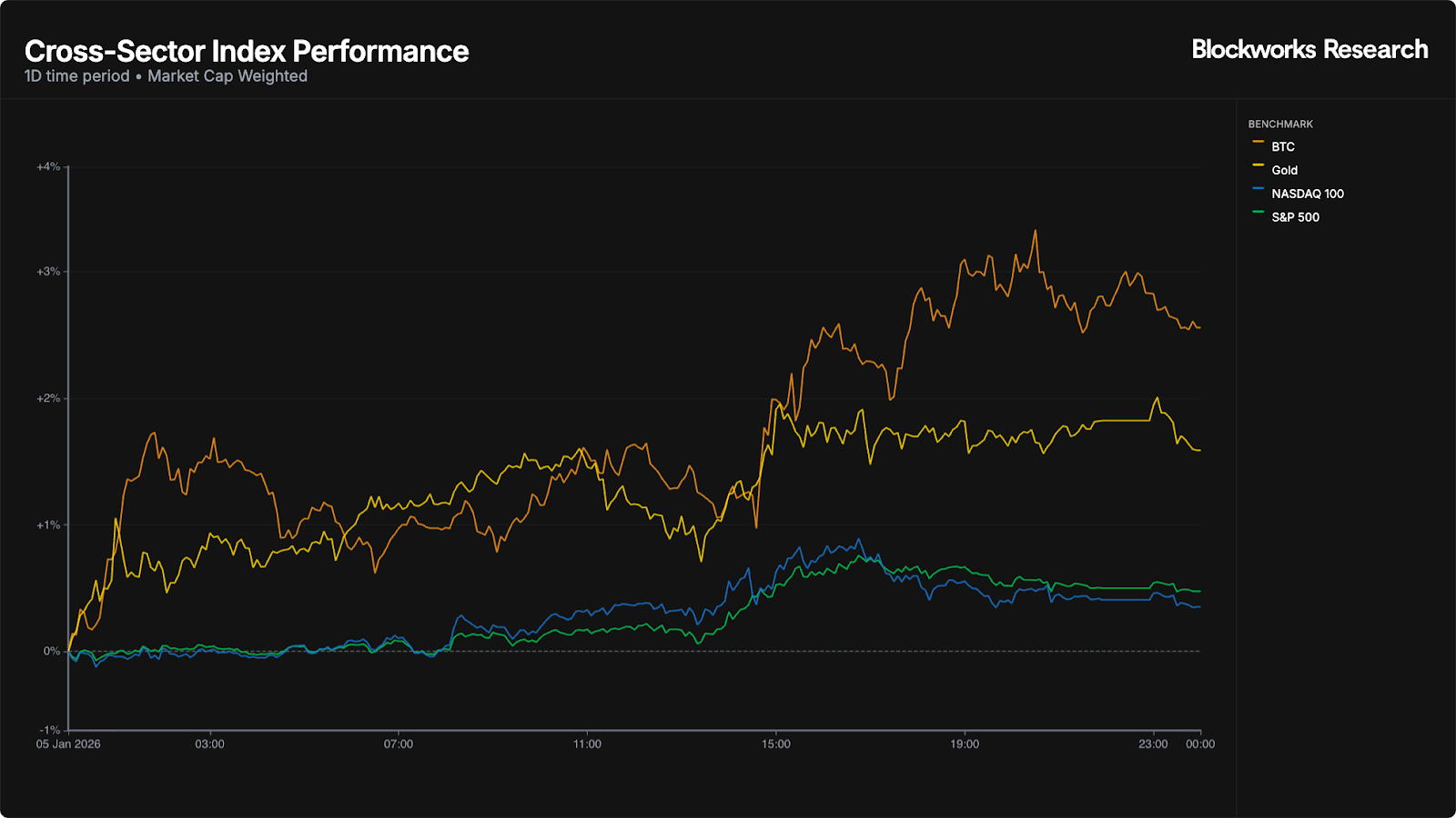 Bitcoin led the tape over the last 24 hours, up about +2.6%, outpacing Gold (+1.6%) and a much quieter move in US equities (S&P 500 +0.5%, Nasdaq 100 +0.4%). After a long period of underperformance in 2025, the year is off to a good start with the marginal buyer showing up in BTC first, ahead of broader risk assets.