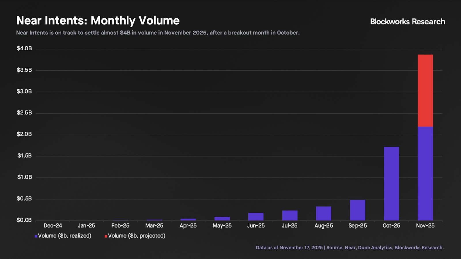 After steady but slow monthly growth, October marked a breakout month for Near Intents. As shown in the chart below, the protocol processed $1.72 billion in volume in October, a 256% MoM increase. November has already surpassed that with $2.19 billion in volume as of Nov. 17, putting Near Intents on track to settle nearly $4 billion this month.