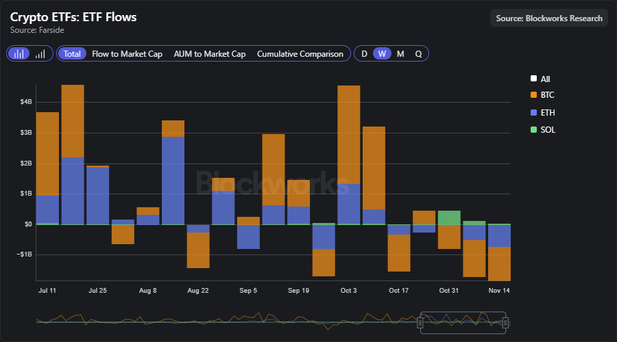 Bitcoin ETFs have flipped to heavy outflows in November, with roughly $3 billion in outflows over the last three weeks as institutional investors de-risk amid macro weakness and liquidity stress. ETH spot ETFs saw ~$1.2 billion outflows over the last three weeks. Meanwhile, Solana ETFs pulled in nearly $650 million, helped by new ETF launches.
