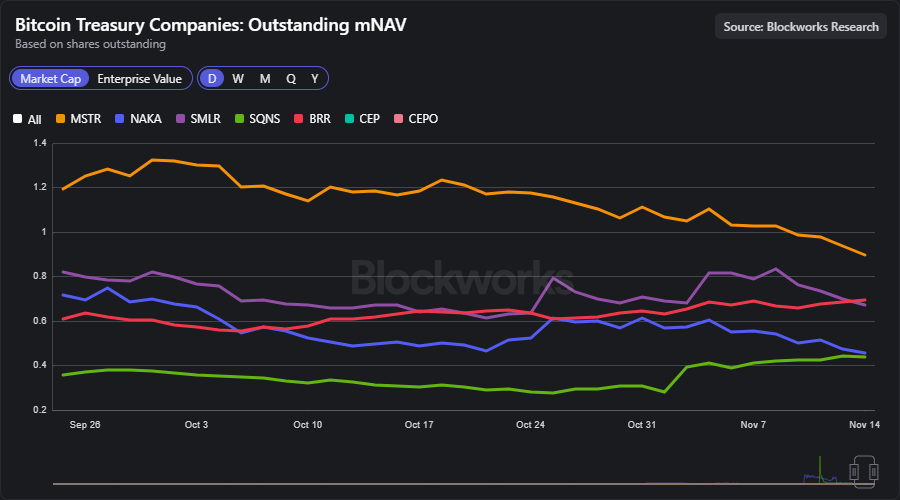 Even perennial outperformers like Strategy (MSTR) are cracking under the pressure, its their mNAV ratio dipping below 1.0, now trading at around 0.9x, a stark inversion from the 2-3x premiums in the early 2025 surge. All other bitcoin treasury companies are now trading materially below NAV, with mNAV ratios ranging from 0.7x to nearly 0.4x.
