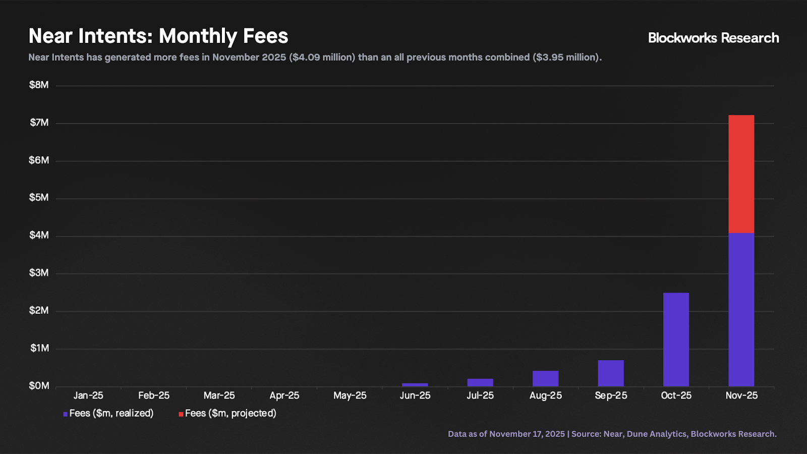 Looking at fees, the growth over the past two months is even more dramatic. Near Intents has generated $4.09 million in fees in November 2025, surpassing the $3.95 million of cumulative fees from inception to October 2025, with nearly two weeks still left in the month. If current activity levels persist, Near Intents is on pace to generate around $7 million in fees in November.