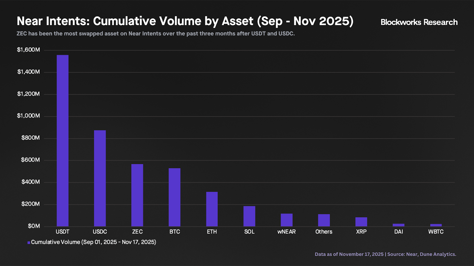The chart below shows the cumulative volume of Near Intents by asset since Sept. 1, 2025. ZEC is the most swapped asset behind USDT and USDC, with $569 million in cumulative volume. A key question is whether Near Intents’ recent activity spike is a temporary effect of ZEC buying demand or the start of more durable growth. The surge in attention could ultimately seed a stickier user base for permissionless swapping across a broader set of blockchains and assets.
