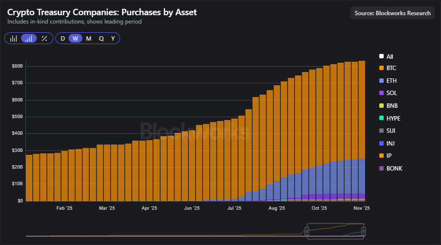 Corporate crypto treasury accumulation has slowed dramatically in November amid compressed equity premiums that curb fundraising for buys. The fading momentum raises questions around whether persistent mNAV discounts will lead these firms to sell crypto assets.