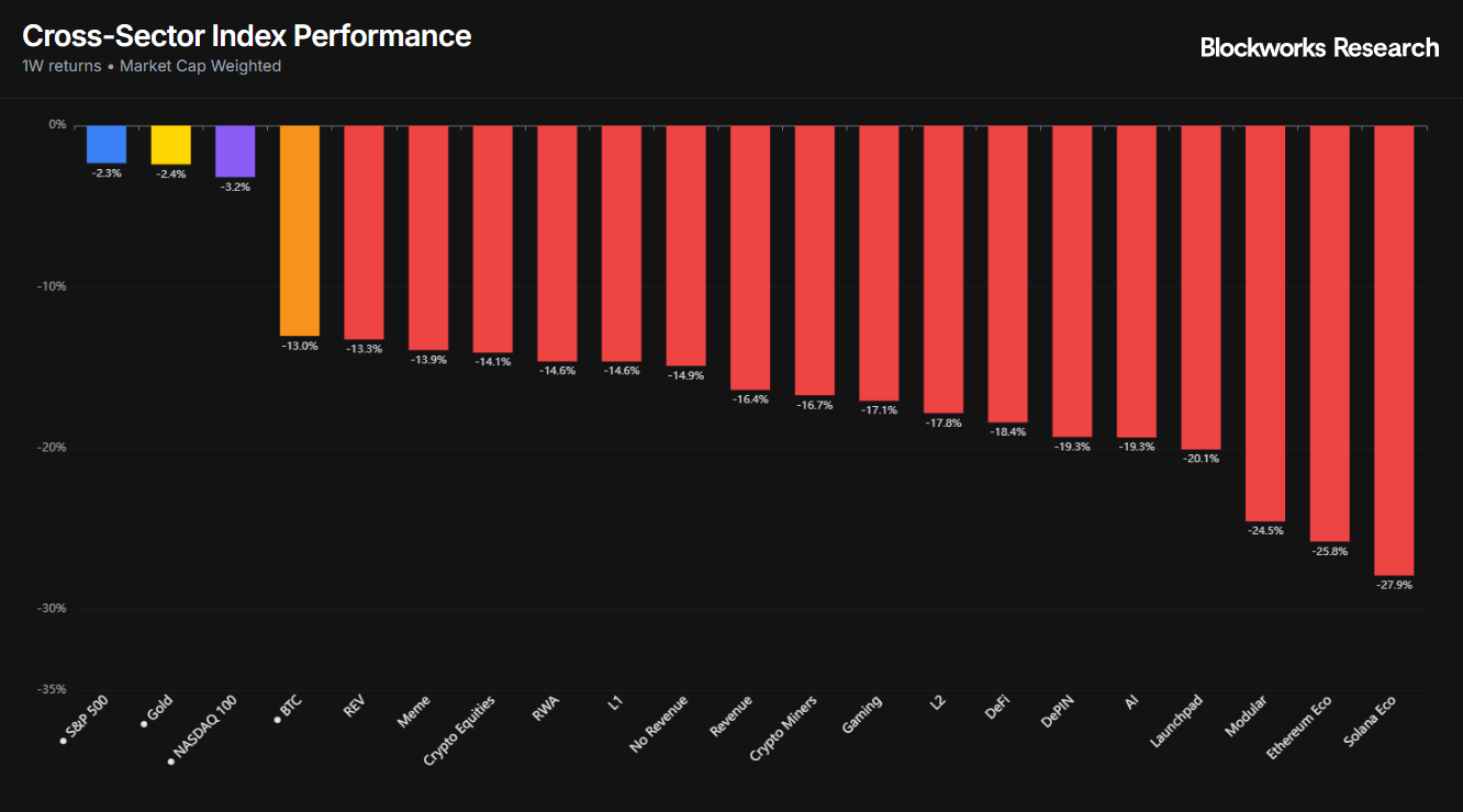 None of our indexes have held up on a one-week view, underscoring crypto's status as the most reflexive asset class amid escalating macro headwinds. BTC is down 13% over the period, holding up the best among crypto investments. Network fundamentals are deteriorating, with our REV index sliding 13.3% as Ethereum and Solana ecosystem tokens crater 25-30%.
