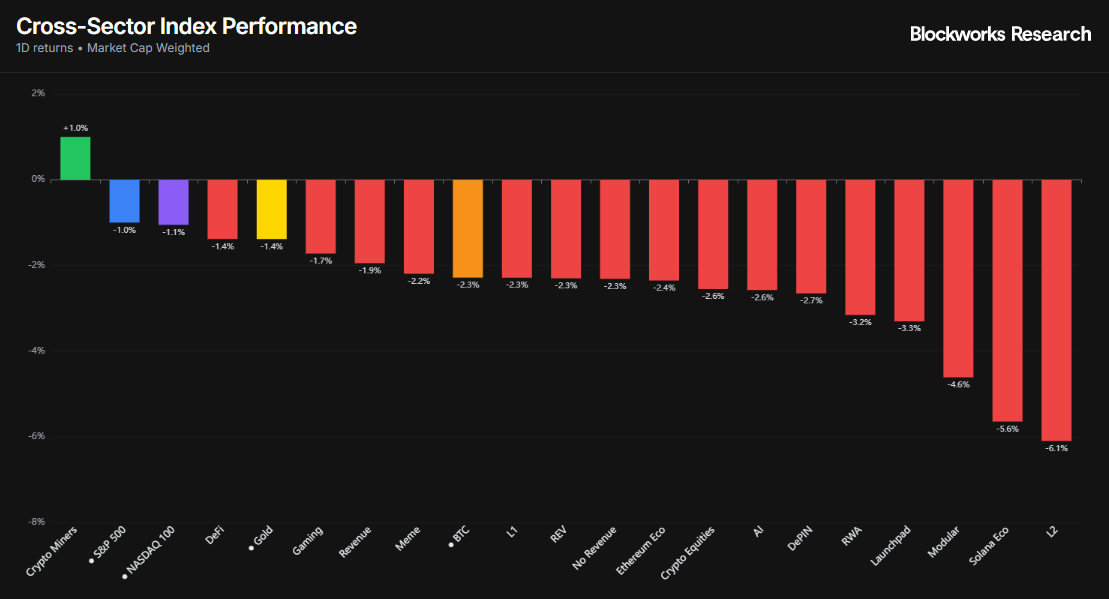 It was a risk-off day across the board, with virtually every major sector in the red except bitcoin miners, which managed a modest +1.0% gain. The hardest-hit pockets were L2 tokens (−6.1%) and the Solana ecosystem (−5.6%), hurt by broader DeFi deleveraging. L1s (−2.3%) tracked our REV index lower at roughly the same pace, while AI (-2.6%), DePin (-2.7%), and RWAs (-3.2%) were marginally worse off.