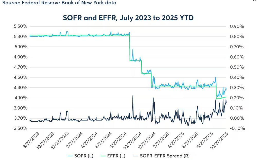 When dollars get scarce, the most speculative asset classes, crypto first among them, always take the hardest and fastest hit. An example of liquidity stress is the widening positive spread (SOFR > EFFR) being a sign of low levels of cash in overnight money markets. This means when cash gets scarce, people are desperate enough to pay more than the Fed’s rate to get their hands on dollars overnight.
