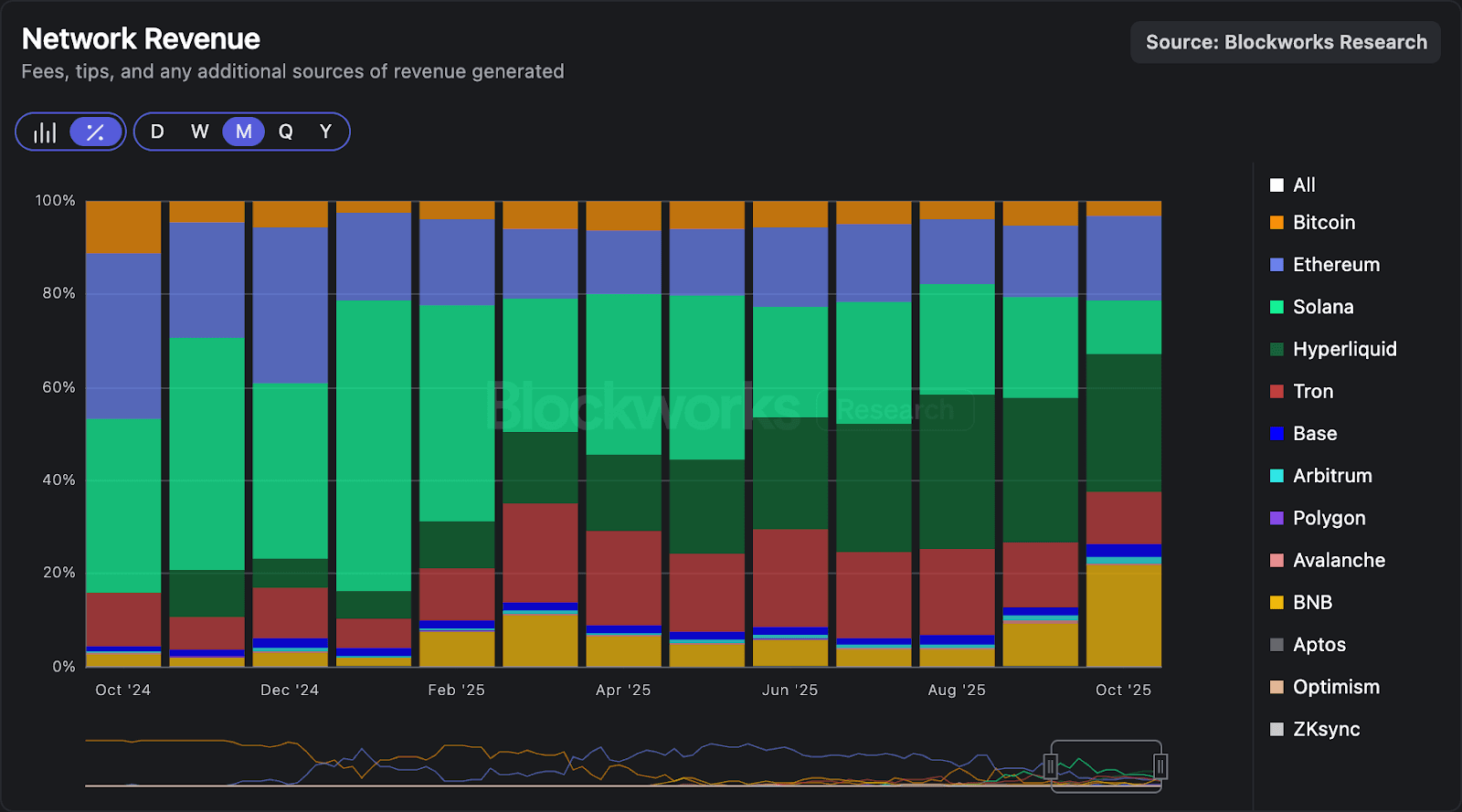 While institutional appetite is high, Solana’s underlying fundamentals are showing mixed signals. Starting with the negative, Solana's Real Economic Value (REV) amounted to $41 million in October, the lowest figure since February 2024. Solana was the fourth-highest chain by revenue market share in October, ending a streak of twelve consecutive months as either first or second. The chart below shows that Hyperliquid was the leading chain by revenue ($105 million) last month, followed by BNB ($77 million) and Ethereum ($65 million).