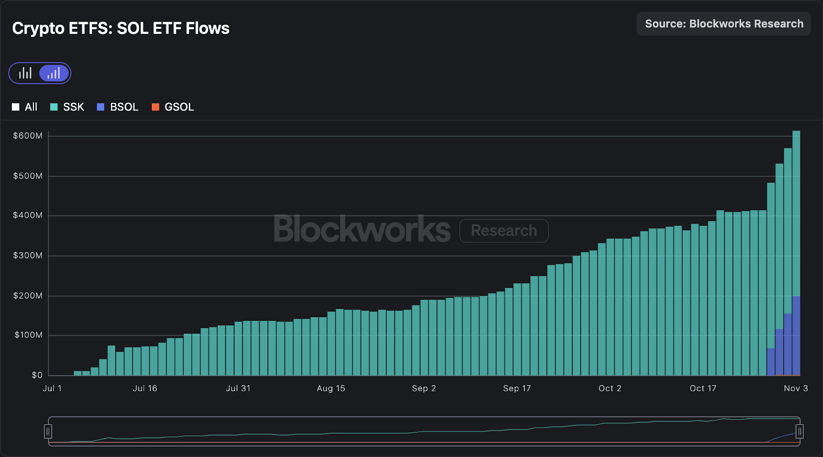 Despite DATCO headwinds, ETF flows have surprised to the upside. The Bitwise SOL staking ETF (BSOL) began trading last Tuesday, seeing immediate success. BSOL led all crypto ETPs in weekly flows last week, with $417 million. As of Nov. 3, BSOL had $420 million in AUM, surpassing SSK's $388 million less than a week after launching. In addition, the Grayscale Solana Trust ETF (GSOL) launched on Oct. 29, with $88 million in AUM as of Nov. 3.