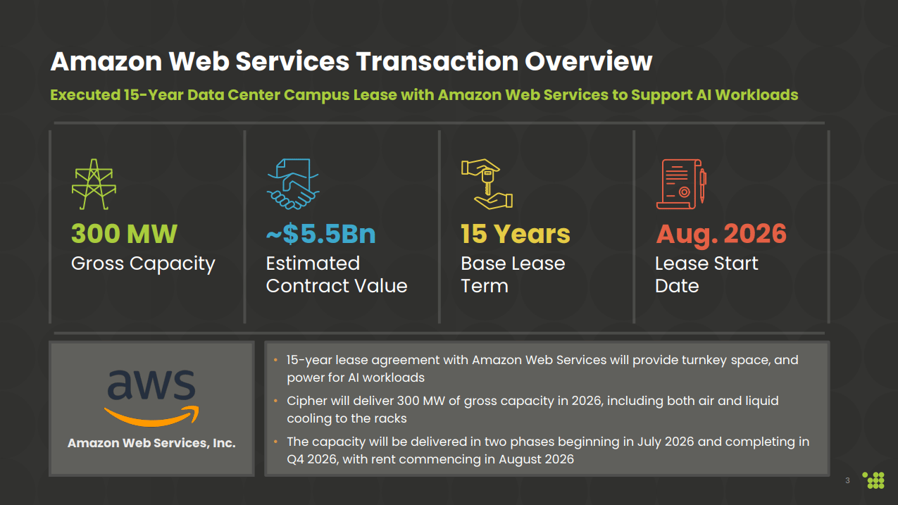 Cipher’s AWS deal and new 1GW Texas campus drove a 22% jump in the stock as investors welcomed the clear strategic direction and growing momentum behind its AI pivot. The company signed a 15-year agreement valued around $5.5 billion to provide roughly 300MW gross capacity for AWS’s AI workloads. Rent is set to begin in August 2026 as new facilities come online. Cipher also announced a joint venture to build a 1GW campus in West Texas, a well suited spot for HPC thanks to its scale, fiber diversity and dual grid connections.