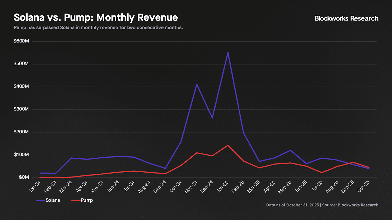 Solana’s decreased value capture is especially evident when contrasted with application revenue on the chain, which has remained more resilient at $92 million, though still down significantly from the January highs. Notably, Pump accounted for 50% of total app revenue on the chain, with October marking the second consecutive month that Pump has surpassed Solana in monthly revenue, despite Pump being valued at under 2% of Solana's market cap (5% if fully diluted). Of course, this is an apples-to-oranges comparison, but it does put into context the scale of Pump's numbers as well as Solana's sharp decline in value capture over the past year.