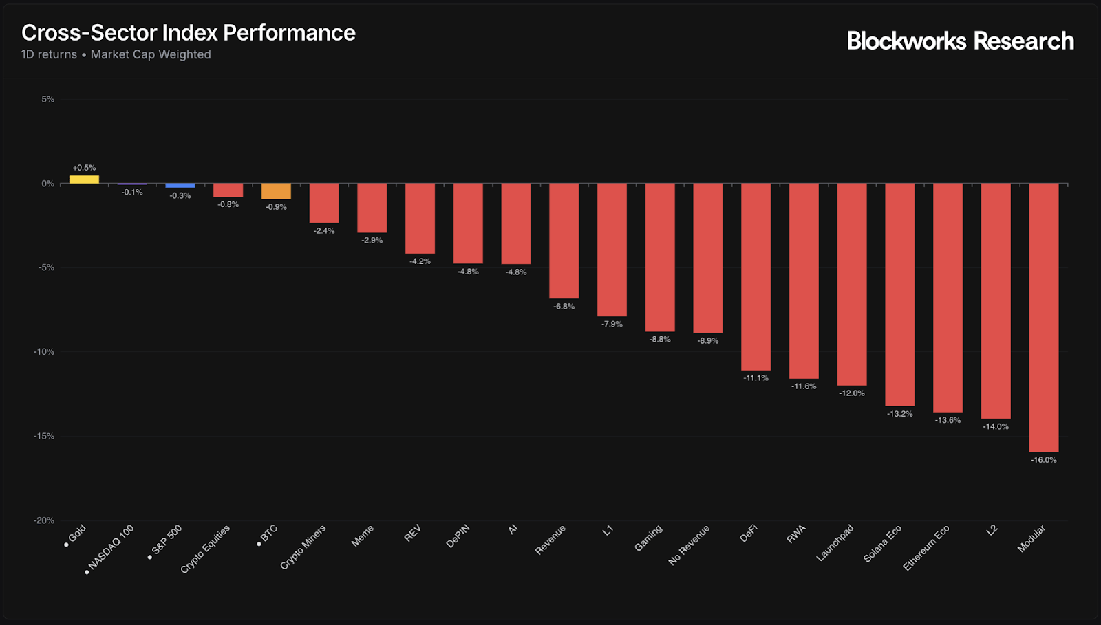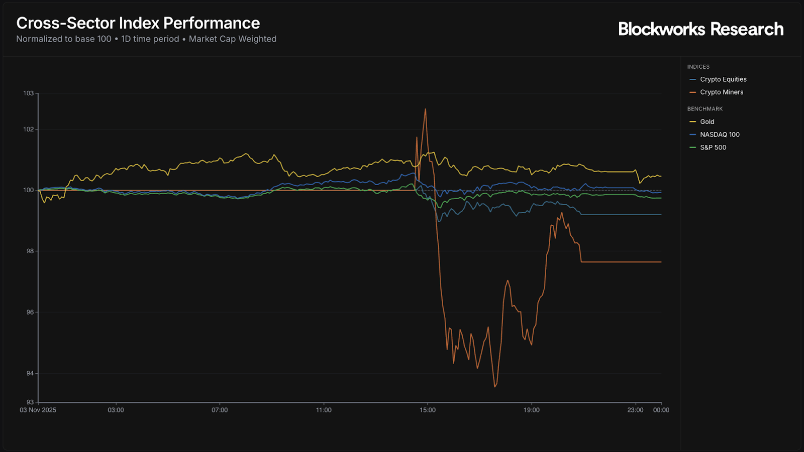 Hi all, happy Tuesday. We saw a sea of red in crypto as markets went risk-off on weakening macro, with the Balancer exploit likely exacerbating the move. On a brighter note, BTC miners IREN and CIFR rallied after unveiling sizable HPC deals, posting strong gains on the day.