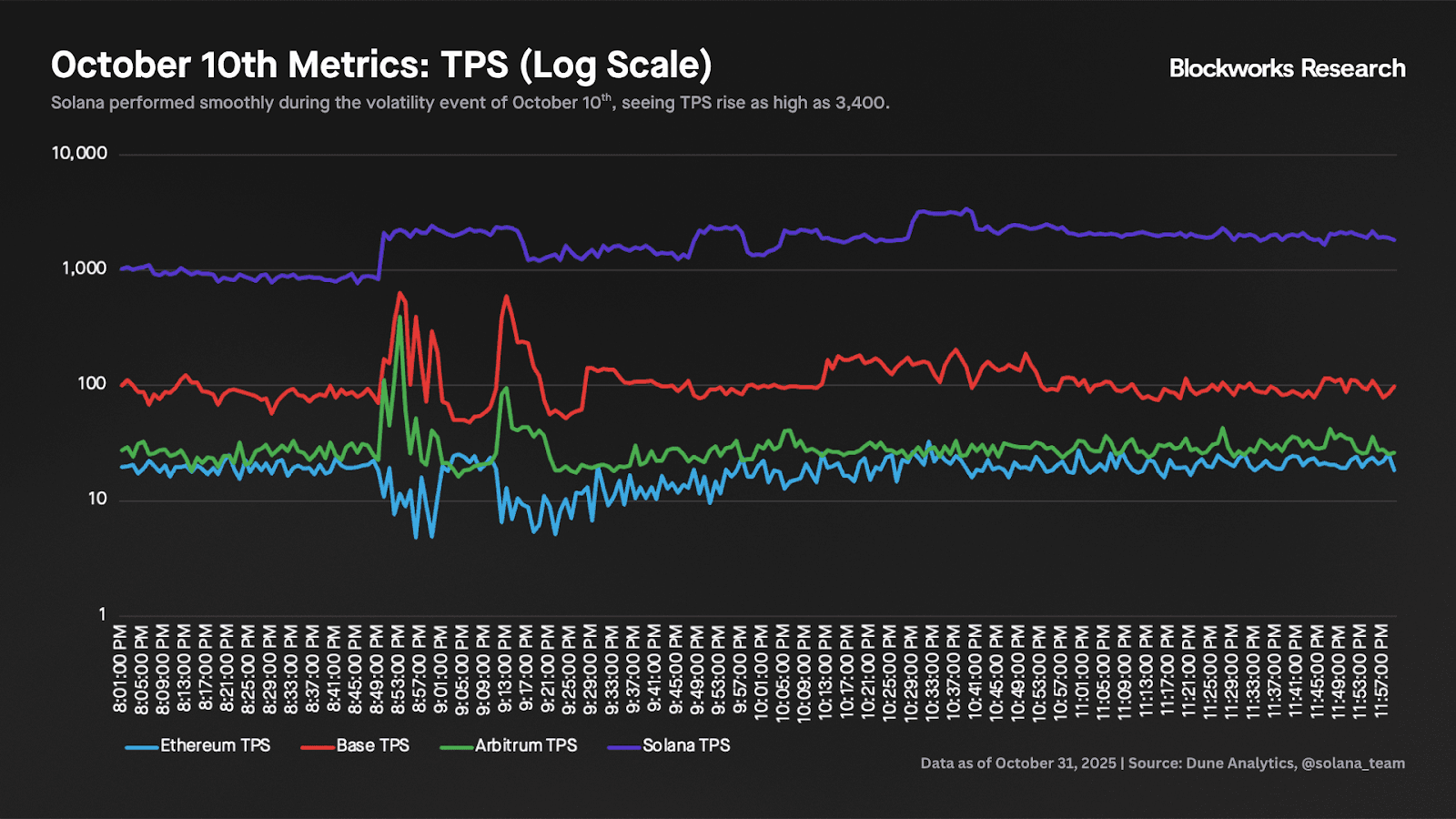 REV and token holder revenue falling to levels not seen since 2024 raises questions about the network’s ability to capture value. That said, decreased value capture is also a function of improved network performance, and users not overpaying for transaction inclusion. As an example, consider Solana’s performance during the Oct. 10 liquidation cascade.