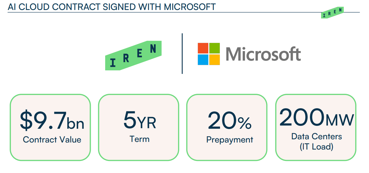 IREN shares jumped 11.5% yesterday on the Microsoft deal, underscoring how markets appreciate contracted AI revenue rather than hash price beta. Microsoft’s five-year, $9.7 billion agreement with IREN marks one of the clearest examples of hyperscalers tapping BTC miners’ power dense campuses for AI. The deal gives Microsoft access to Nvidia GB300 capacity, includes ~20% prepaid capital to IREN, and is tied to new liquid-cooled build-outs at IREN’s 750MW Childress campus that target ~200MW of critical IT load. Cash from Microsoft's department will help finance GPU purchases. Note that IREN sets itself apart from other transitioning miners by focusing on operating its own GPUs, positioning as a cloud compute provider rather than colocation model.