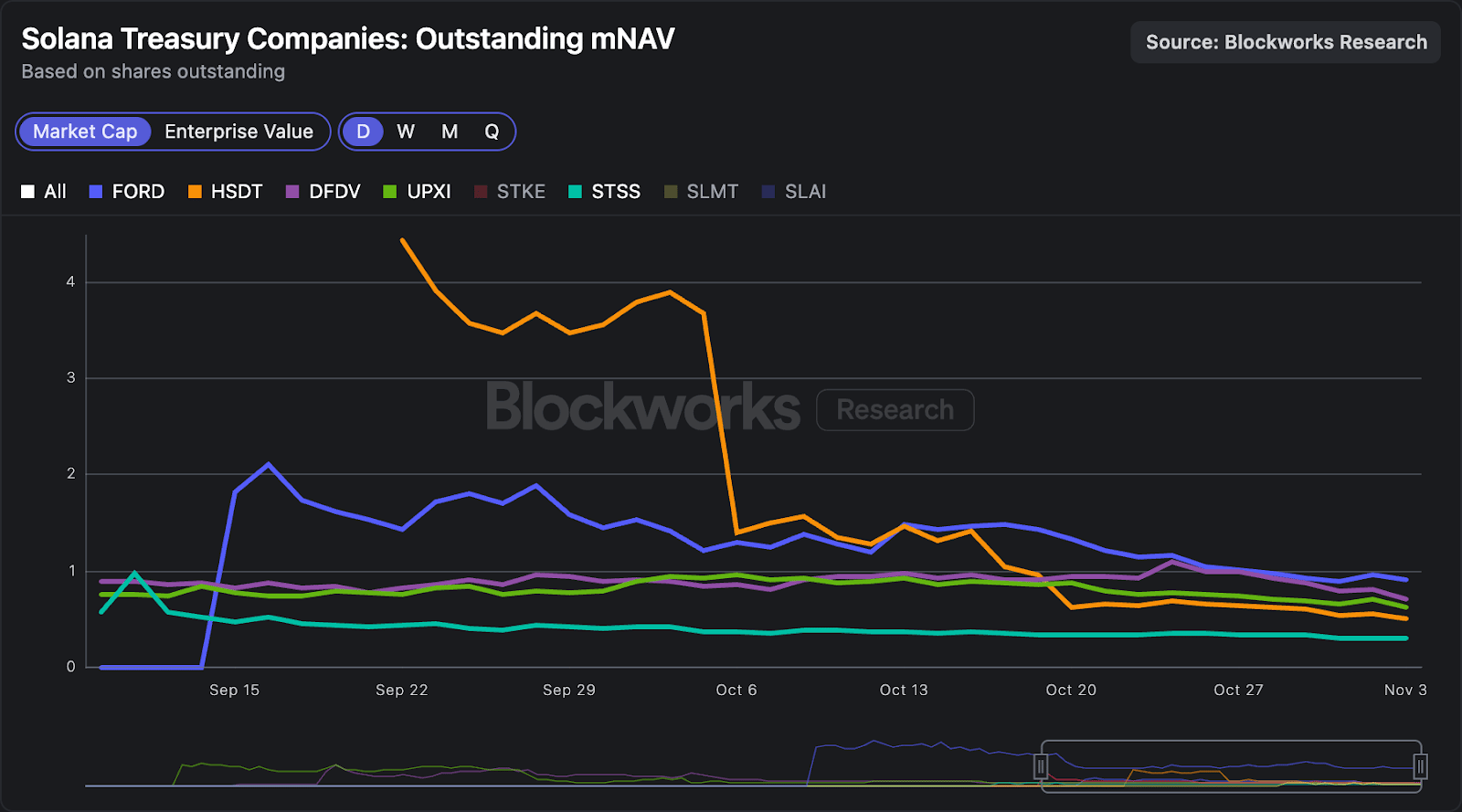 Let’s start with institutional flows. The pace of purchases from Solana DATCOs has slowed considerably, with 1.92 million SOL purchased in October vs. 9.84 million SOL in September. The chart below shows that the five largest SOL DATCOs are all trading at a discount to outstanding mNAV as of Nov. 3, significantly tightening their financing conditions. FORD, the largest SOL DATCO with 6.28 million in token holdings (~$1 billion), is trading at a slight discount to mNAV (0.91x). However, peers are trading at mNAV ratios between 0.3x and 0.7x, introducing the risk that some of these DATCOs pursue a similar strategy to the one employed by ETHZilla, which sold approximately $40 million of its ETH treasury holdings to repurchase shares until its discount to mNAV is normalized.