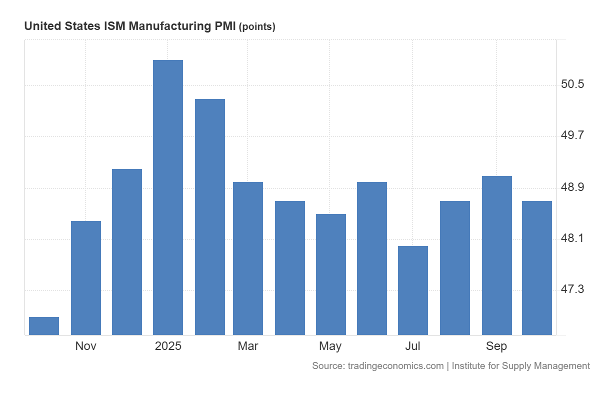 The day’s weakness across crypto markets likely reflects tightening financial conditions, with traders waking up to a more hawkish Fed tone, a strengthening dollar (DXY approaching 100), and a rising US 10-year yield nearing 4.1%. The October ISM Manufacturing print came in at 48.7, highlighting weak underlying economic activity (<50 contraction) and likely contributing to the broader risk-off tone.