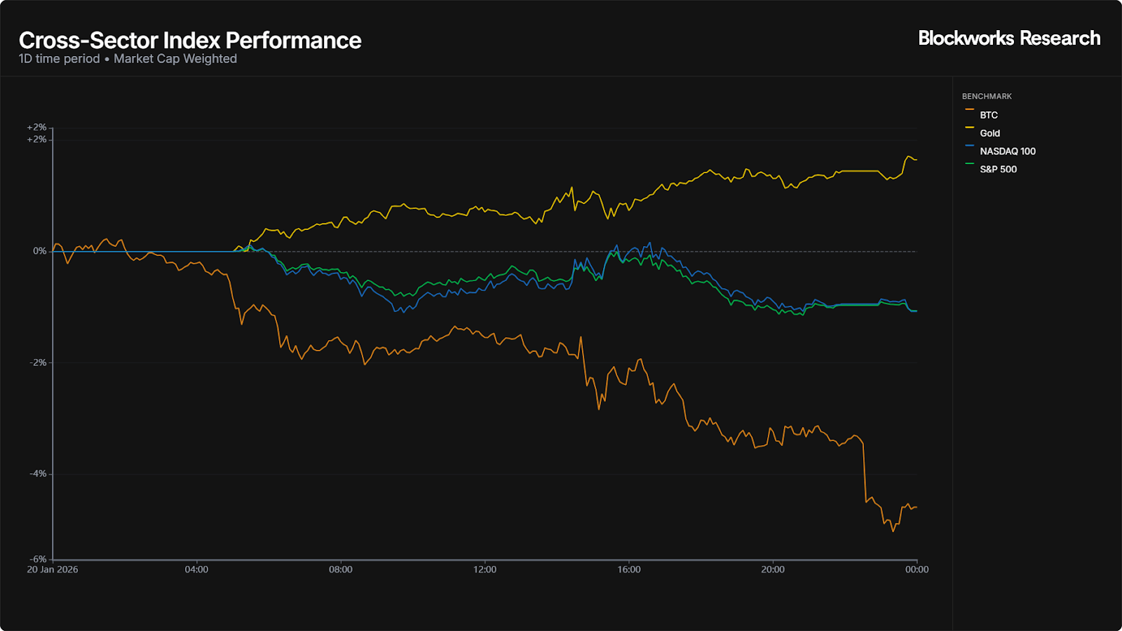The intraday chart highlights a clear divergence that began in the early morning hours of Jan. 20. While Gold maintained a steady upward trajectory throughout the day, BTC experienced two distinct legs down: one during the London open, and a more severe flush during the US afternoon session, briefly touching the -6% mark before a marginal recovery.