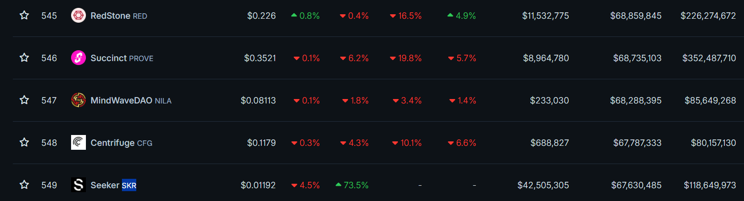 With a circulating supply of 5.7 billion, the current market cap sits at approximately $66 million, and a FDV of $116 million. This suggests that the market is pricing Seeker similarly to Centrifuge (CFG), Redstone (RED) and Succinct (PROVE), three other projects with high ambition and which compete in emerging categories.
