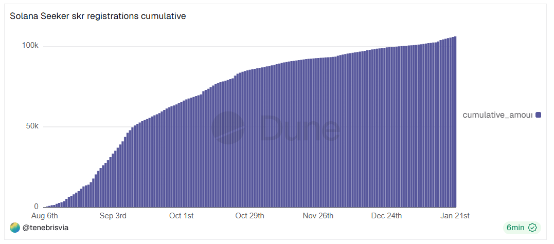 By contrast, the Seeker phone skipped the “struggle phase” entirely by lowering the barrier to entry. At half the original price of the Saga (which was $1,000), the Seeker’s massive 150,000-unit install base is what gives the SKR token its initial weight. As of Jan. 21, 2026, there were over 100,000 .skr domain registrations.