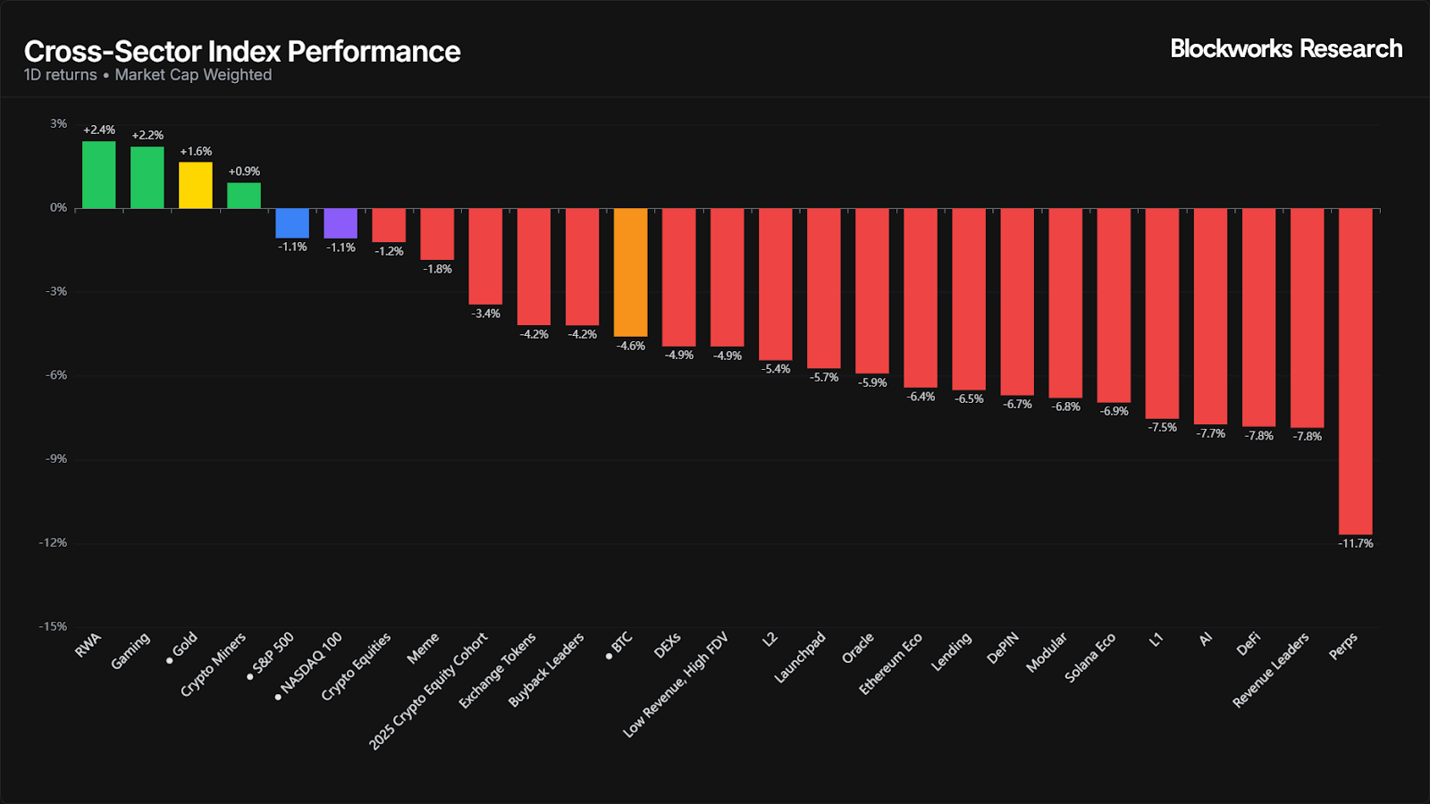 BTC fell 4.6%, leading a sharp decline across the crypto complex that saw nearly every major sector finish in the red. In stark contrast, Gold acted as the primary beneficiary of the flight to safety, climbing 1.6% to be one of the few green spots on the board. Traditional equities also felt the pressure, with the S&P 500 and NASDAQ 100 both sliding 1.1%.