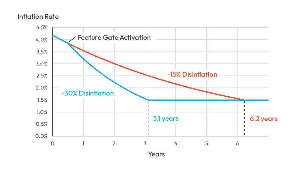Lostin and Ichigo from Helius published a governance proposal (SIMD-411) to accelerate Solana’s emission schedule by doubling the disinflation rate from -15% to -30%, keeping the 1.5% terminal inflation unchanged. The authors argue that this simple, predictable parameter change would bring inflation from ~4.18% today to 1.5% in ~3.1 years (early 2029), rather than ~6.2 years (early 2032). After six years, this simple change would cut 22.3 million SOL ($2.9 billion) vs. the current inflation path, reducing the “leaky bucket” sell pressure. Second-order effects of the proposal would be lower nominal staking yields, a modest increase in validator unprofitability, and lower opportunity cost of using SOL in DeFi.