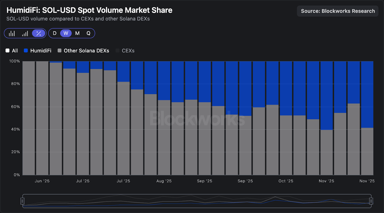 In terms of fundamentals, HumidiFi has consolidated as the top prop AMM by trading volume over the past few months. It accounted for 51% of SOL-stablecoin volumes on the chain in November, and for 36% of total Solana DEX volumes, surpassing all other DEXs, including "traditional AMMs" such as Orca, Raydium and Meteora.