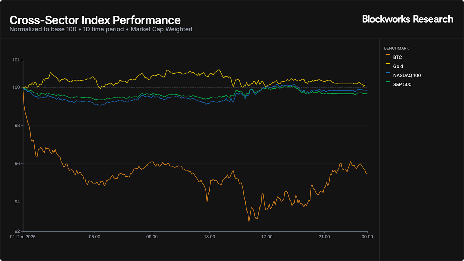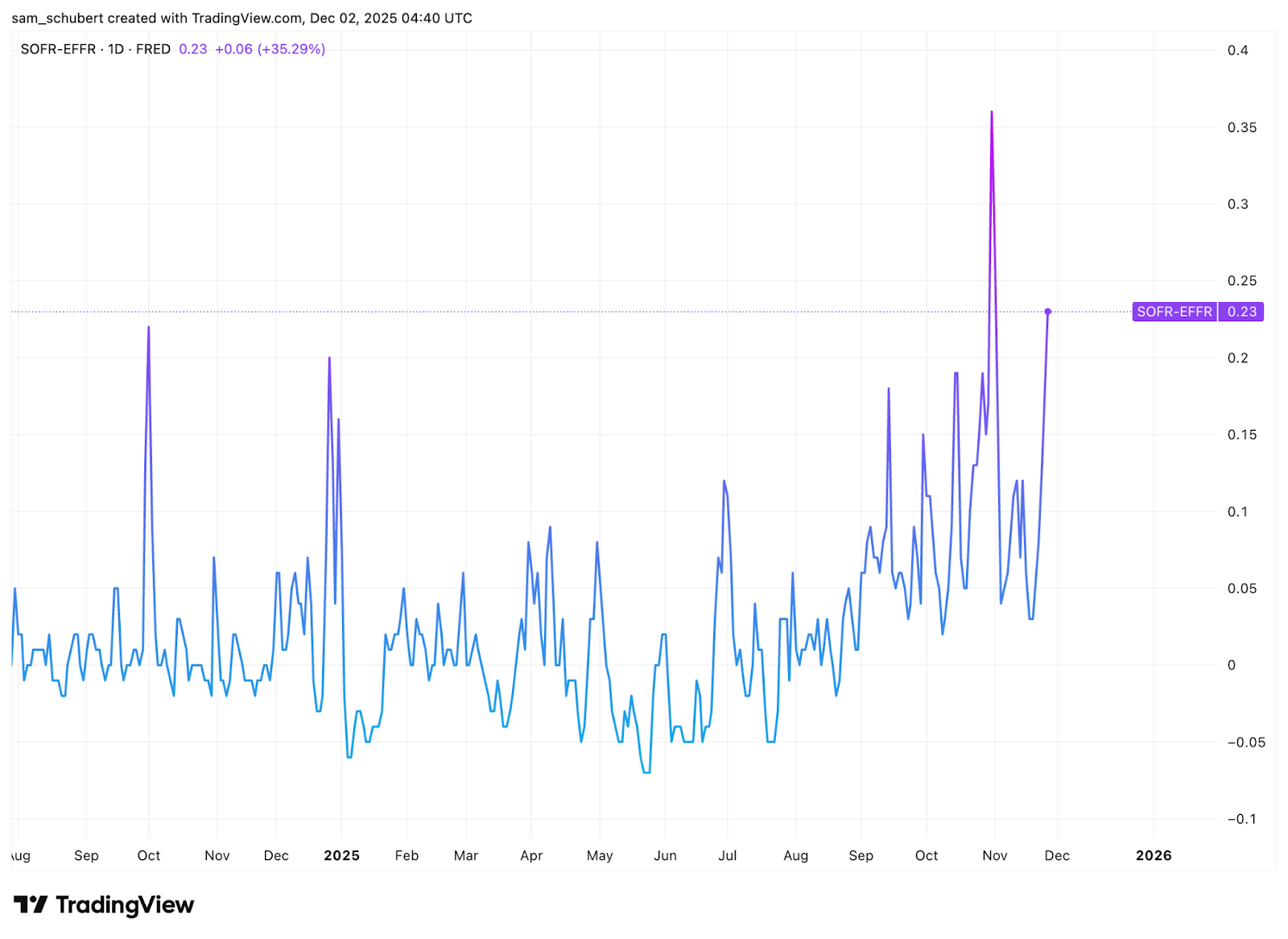 Hi all, happy Tuesday. Markets came under pressure on Monday as BTC and crypto indices sold off with December rate cut odds climbing to nearly 90%. Meanwhile, SOFR trading above the Fed upper bound has kept liquidity stress in focus.