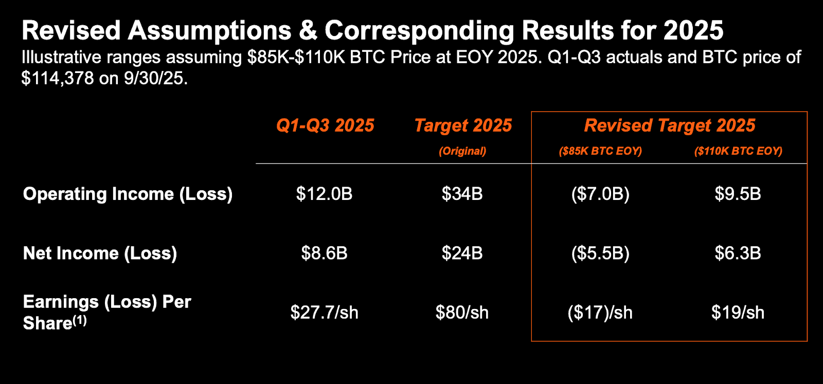 Management cut its year end BTC price assumption from $150K to a range of $85K to $110K, lowering its BTC dollar gain target to about $8.4 billion to $12.8 billion and making full year GAAP earnings highly sensitive to the final BTC print. On the investor call, they highlighted that a year end BTC price below roughly $94K would mean operating and net losses, while above $94K would support positive income.