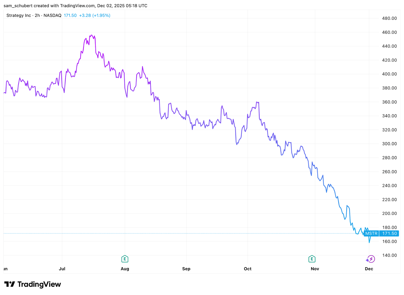 Strategy (MSTR) was front and center yesterday as the stock extended its drawdown. Shares traded below $160 on Monday before closing near $171, leaving MSTR down roughly 37% over the past month and over 60% from July 2025 highs.