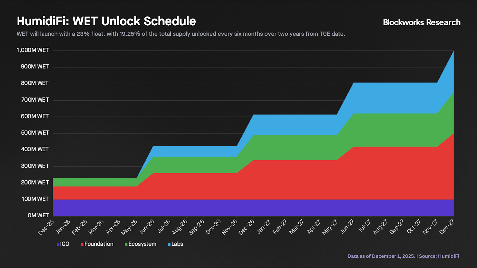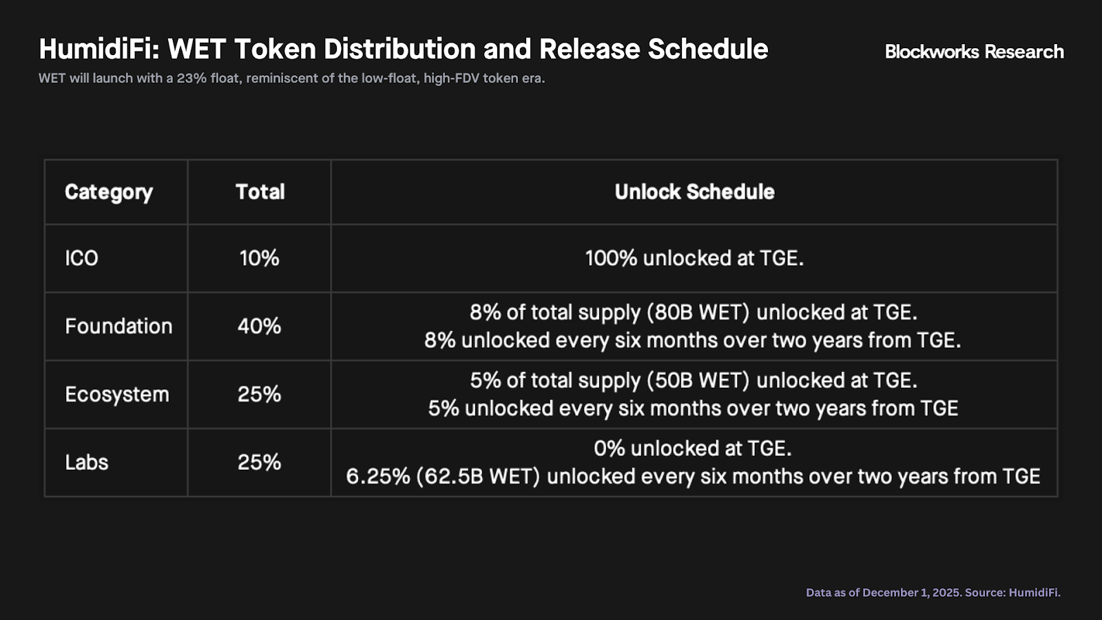 HumidiFi’s WET token sale will take place tomorrow, Dec. 3. WET will be the first ICO on Jupiter’s Decentralized Token Formation (DTF) platform, with trading available on Meteora and HumidiFi at TGE on Friday, Dec. 5. For context, HumidiFi is a prop AMM developed by Temporal, a Solana-native R&D firm. Aside from HumidiFi, Temporal also runs Nozomi, a transaction landing service on Solana, and Harmonic, a block building system aiming to compete with Jito. Ahead of the ICO, the team published an article with WET’s tokenomics.