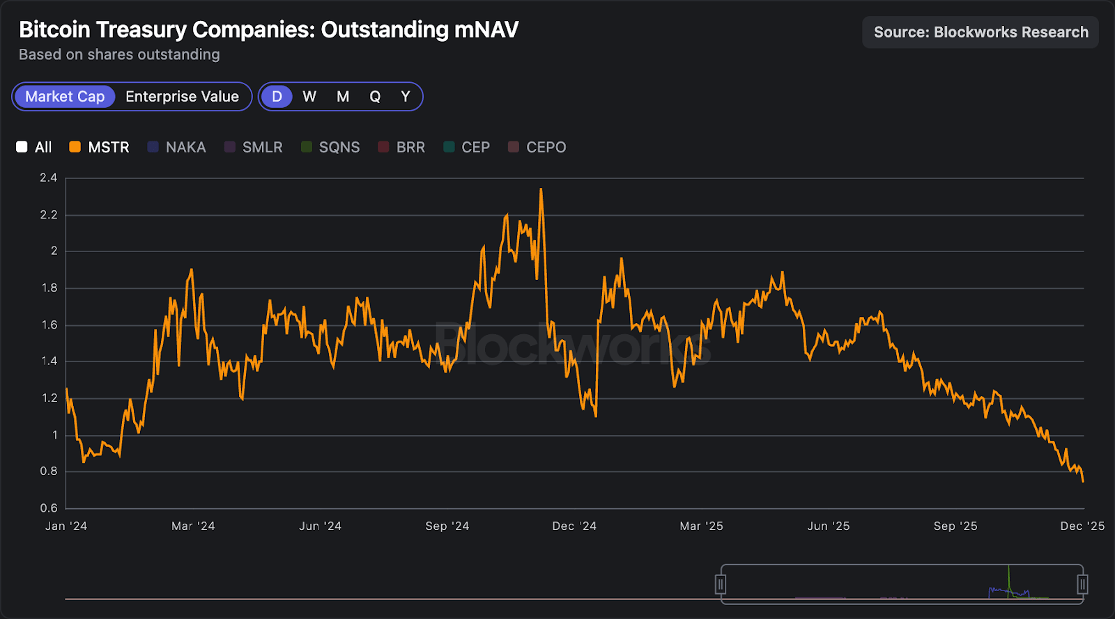We see the outstanding mNAV ratio dipping below 1 in early November and now sliding toward 0.75 as a clear reflection of the current risk-off environment. This dynamic also raises concern about potential cascading effects since these vehicles can amplify both drawdowns and forced selling if the equity trades at a persistent discount to underlying assets.