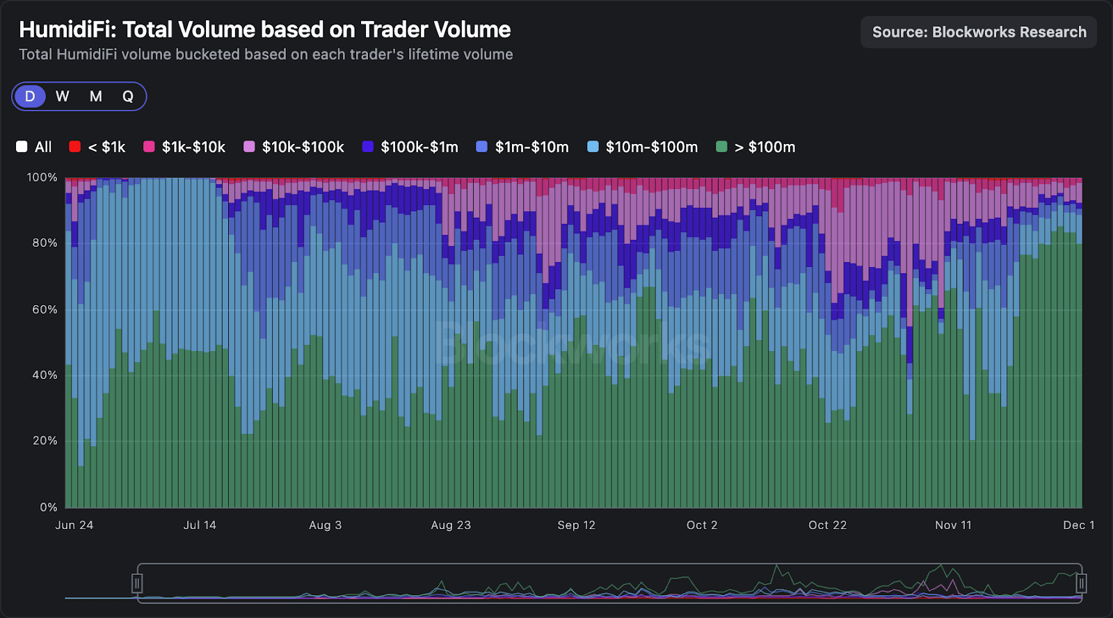 In the announcement, HumidiFi noted that a snapshot was taken on Nov. 11 to determine the pre-sale allocation reserved for HumidiFi users (i.e., top traders). The chart below shows that traders with a lifetime volume of over $100 million have historically accounted for more than 50% of HumidFi’s daily volumes. These wallets are most likely market makers and arbitrage bots, and will likely be whitelisted for the sale.