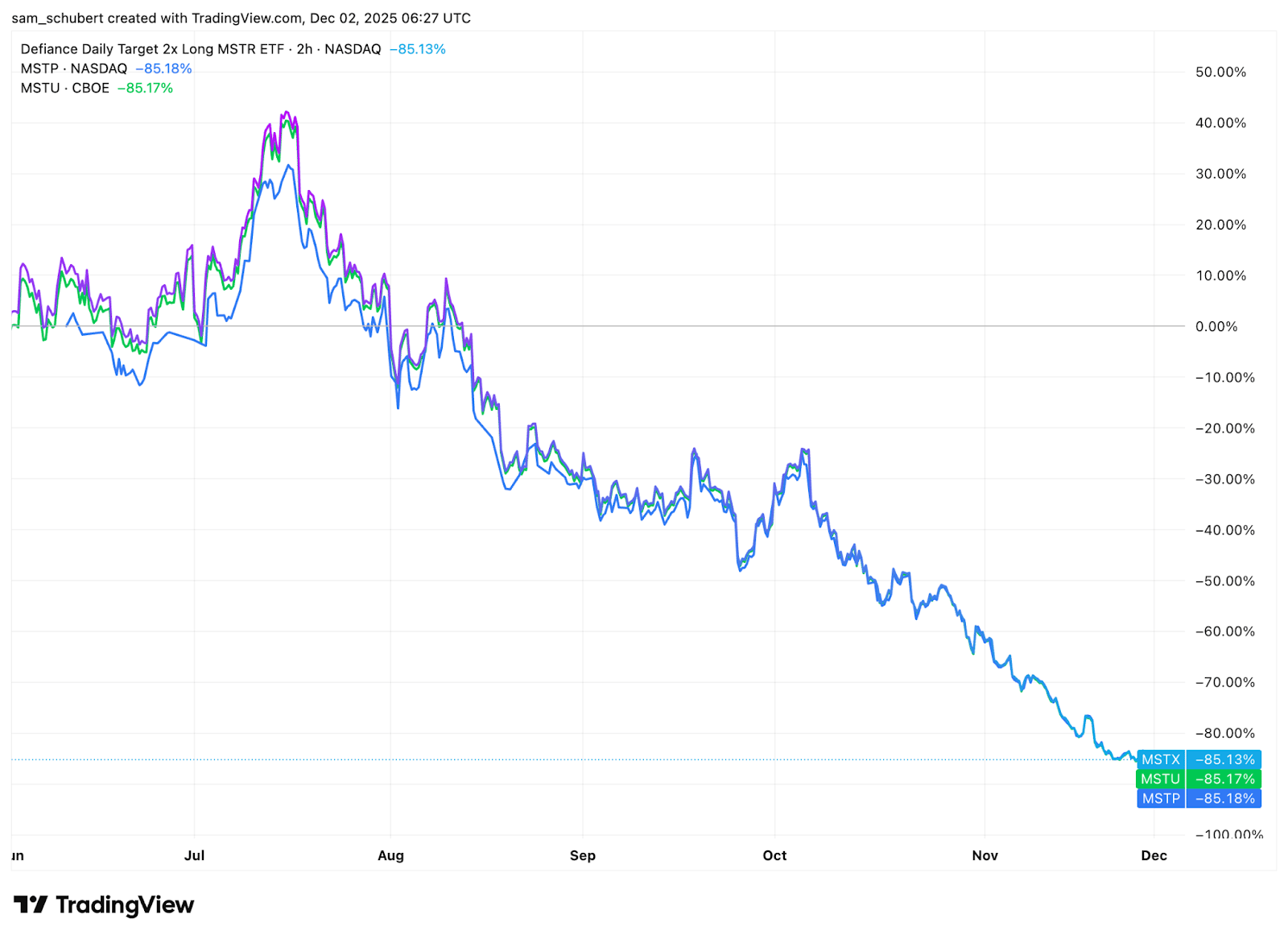 Leveraged ETFs built around the Strategy trade are bearing the brunt of the move, with MSTX and MSTU, which target 2x Strategy’s daily return, are among the 10 worst performing US ETFs this year after losses of more than 80%. The newer MSTP is down a similar amount since launch and the trio’s value shrinking from over $2.3 billion in early October to about $0.8 billion today. Together these products show how a 60% drawdown in the stock and a 30% pullback in BTC can be magnified by volatility decay, where compounding gains and losses can chip away at returns even if the stock ends flat. This has left the late retail buyers with heavy losses, turning the once popular levered MSTR trade into a textbook case of negative reflexivity.