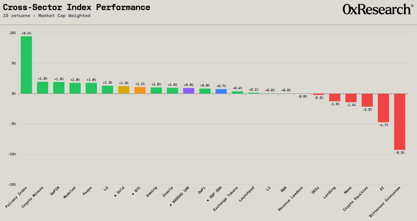 On the sector front, Privacy led the market, up 9.4% on the day. This was largely driven by ZEC, which surged 14% and accounts for 35% of the index.