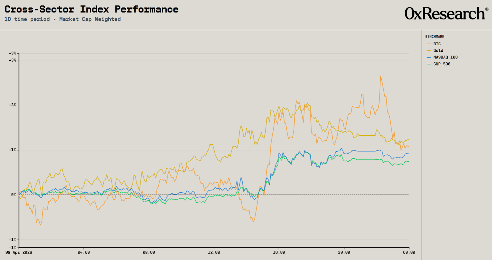 It was a strong day across markets, with all four major benchmarks ending in the green. Gains were led by gold and BTC, up 1.23% and 1.08%, respectively, followed by the tech-heavy Nasdaq and S&P 500, which rose 0.91% and 0.74%.