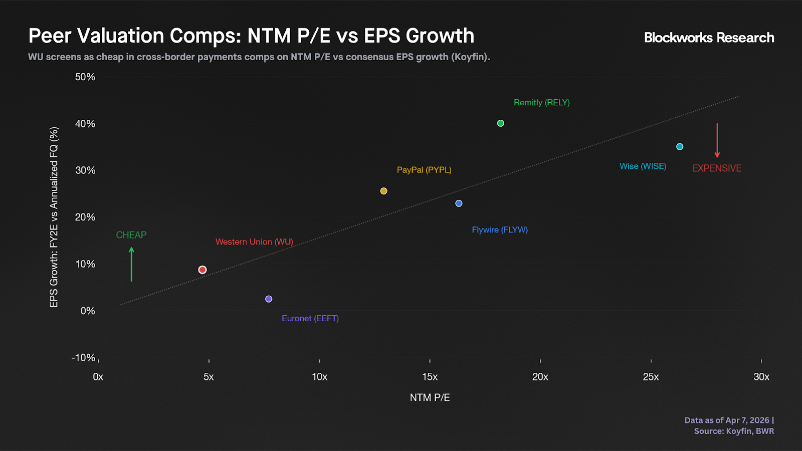 Revenue has been declining for three years, which is why the stock trades at <5x PE. But if the new growth segments and digital-asset infrastructure collectively bend the top line back toward growth, WU stops being a dividend play and starts looking more like a digital-payments infrastructure company. Peers in the space trade can trade well above 10x. Even a modest re-rate coupled with EPS growth presents meaningful upside from here.