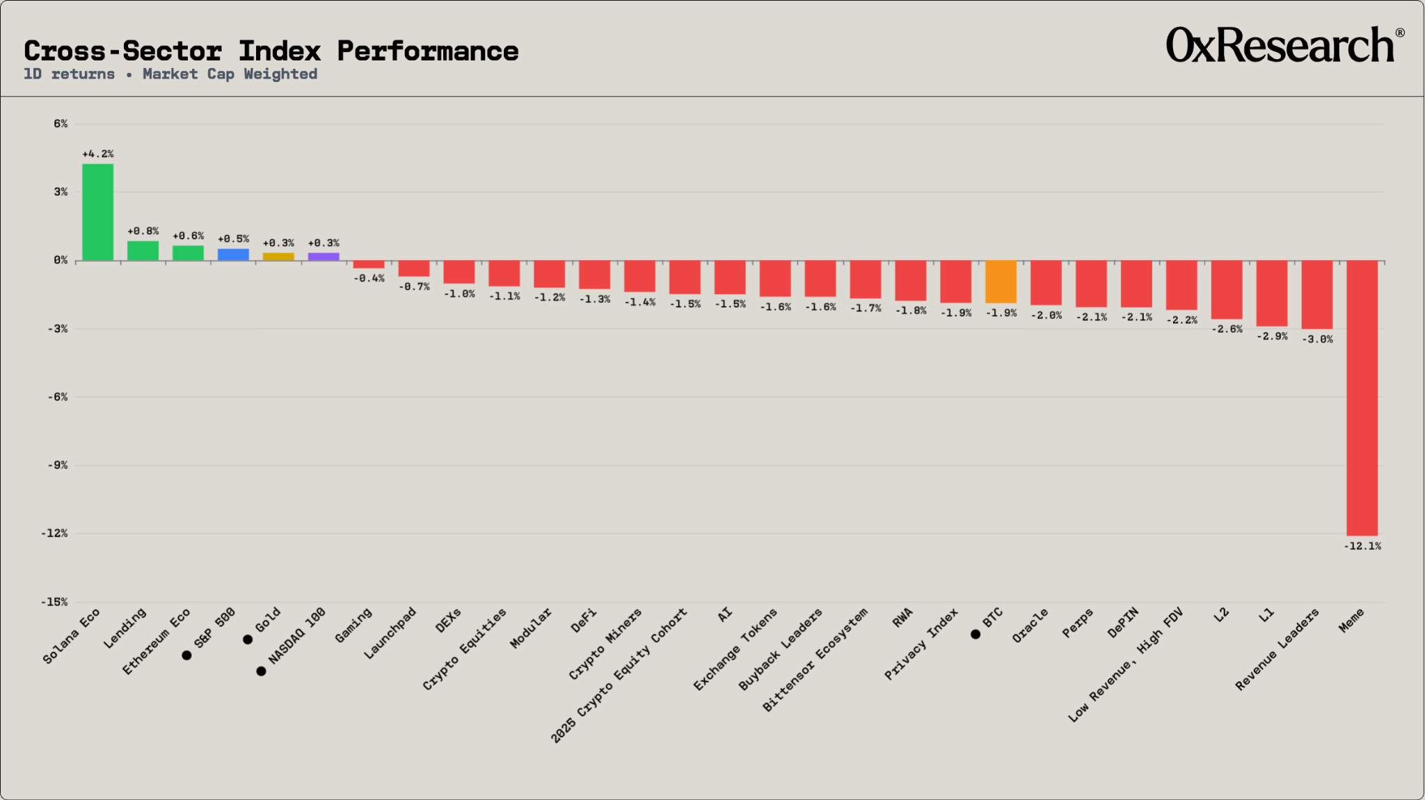 The S&P 500 closed Monday at +0.5%, with the Nasdaq (+0.3%) and gold (+0.3%) eking out similarly modest gains. Bitcoin diverged the other way, finishing -1.9% and underperforming both benchmarks for the second straight session. The broader crypto tape was almost entirely red with one notable exception — Solana Eco (+4.2%). Otherwise, the only sectors above water were Lending (+0.8%) and Ethereum Eco (+0.6%).