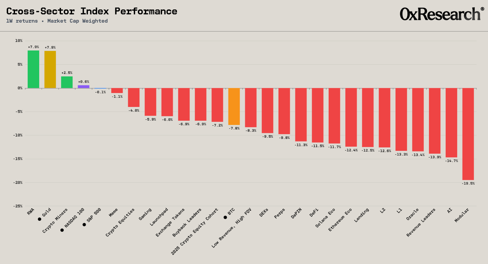 Within crypto, the week was defined by broad de-risking in high-duration bets, not a nuanced rotation. RWA (+7.9%) was the standout on the crypto side, while Crypto Equities (−4.8%) held up better than onchain sectors. The heaviest pressure concentrated in core trading and “growth narrative” buckets, with DEXs and Perps both down ~10%. The biggest capitulation showed up in Modular (−19.5%), with AI also weak at −14.7%.