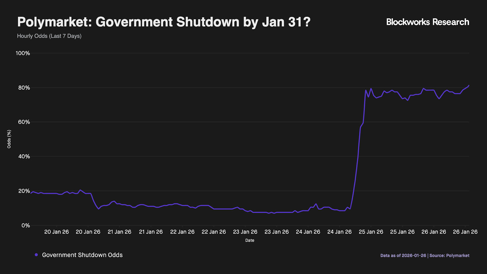 BTC fell 7.8% over the past week, underperforming both traditional risk and safe havens: Gold rallied 7.9%, the NASDAQ 100 gained 0.6%, and the S&P 500 was roughly flat (-0.1%). One reason for Gold’s continued outperformance is the worsening political backdrop and a strengthening debasement trade: On Polymarket, the odds of a US government shutdown by Jan. 31 rose from 9% to 81%.