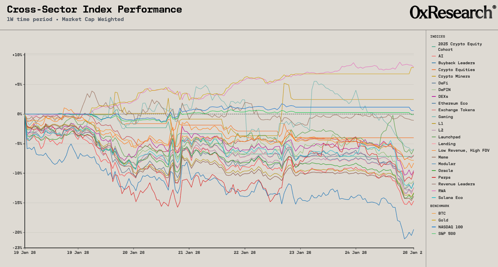Crypto de-risked broadly last week, with pressure concentrated in high-beta onchain sectors.