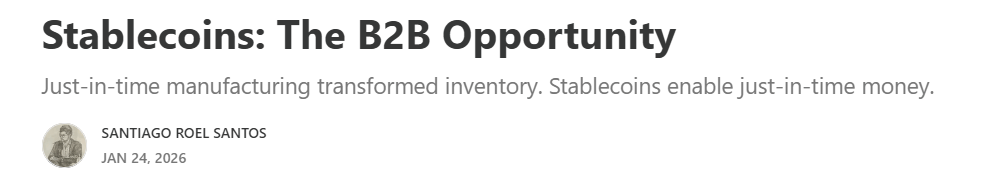 Santiago Santos argues that the true “alpha” for stablecoins lies not in fighting the consumer credit-card duopoly, but in revolutionizing the $25 trillion B2B cross-border payment market.